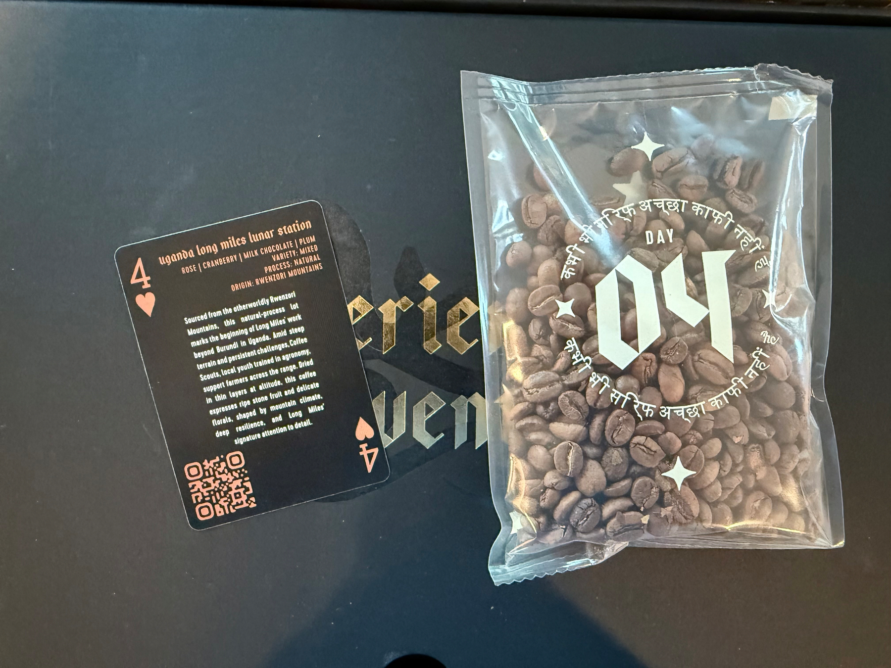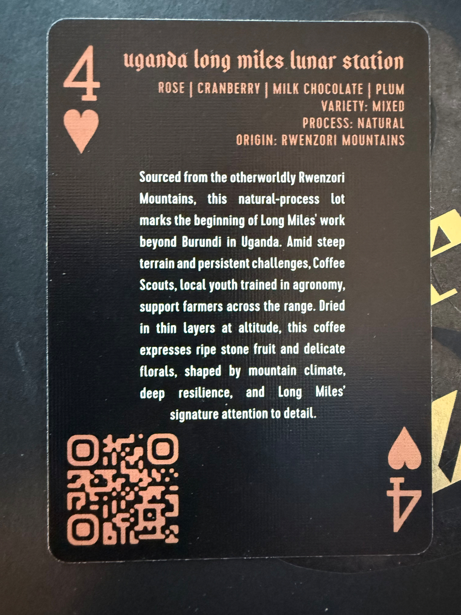The Four of Hearts brings us to Uganda’s Rwenzori Mountains, where the terrain is steep, the climate dramatic, and the coffee scouts apparently tough enough to climb spaceships. Long Miles calls this their Lunar Station, which sounds like the kind of branding NASA would use if NASA was into extremely delicate florals and stone-fruit nuance.